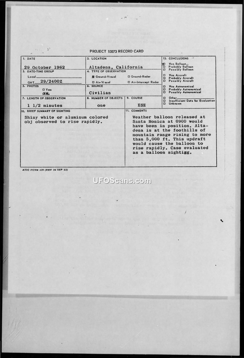 This document is a Project 10073 record card and formal report regarding a UFO sighting in Altadena, California, on 29 October 1962. The Air Force concluded the object was a weather balloon released from Santa Monica Airport.