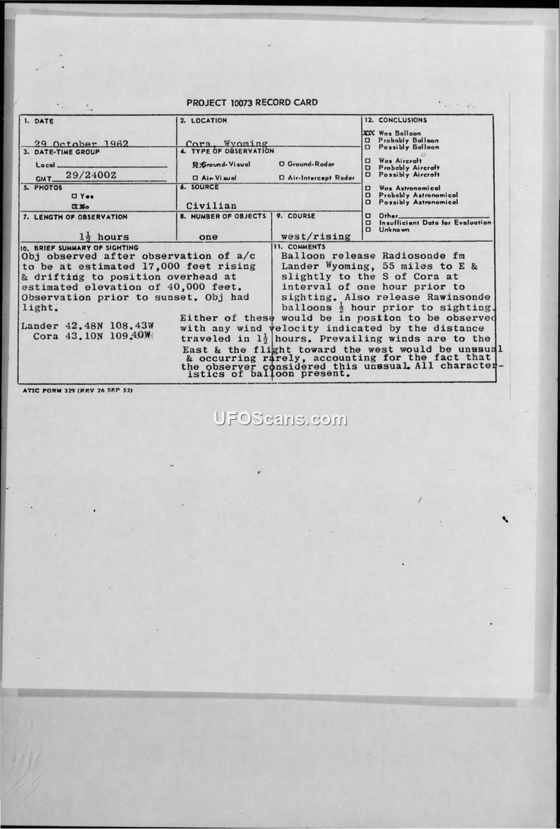 A witness in Cora, Wyoming, reported two objects on 29 October 1962. One was identified as a conventional aircraft, while the second remained unidentified after an Air Force investigation.
