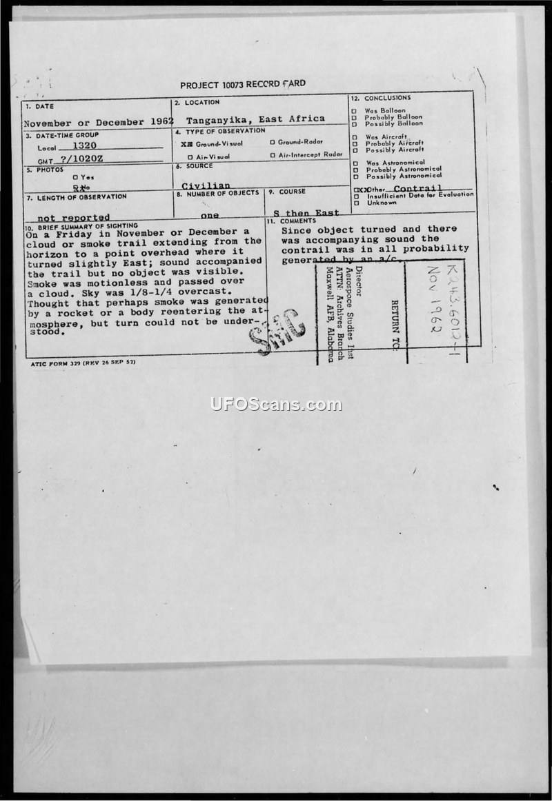 A witness in Songea, Tanganyika, reported a mysterious smoke trail in late 1962. The Air Technical Intelligence Centre concluded the event was likely an aircraft contrail.