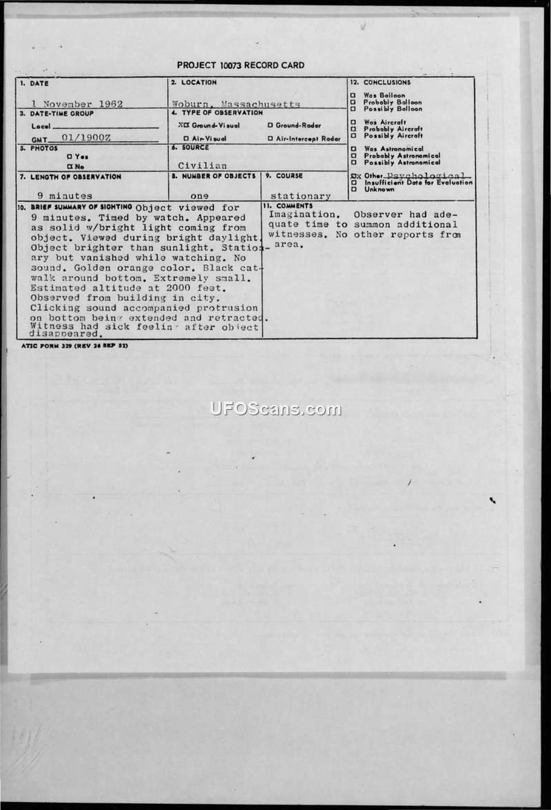 Project 10073 Record Card — Woburn, Massachusetts, 1 November 1962