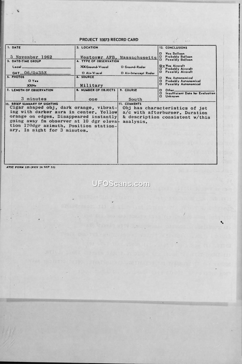 This document contains two Project 10073 record cards and associated teletype messages regarding UFO sightings reported at Westover Air Force Base in November 1962. The first incident, occurring on November 5, 1962, involved a cigar-shaped object observed by A/1C Francis H. Beniot. The witness described a dark orange object with a vibrating aura that appeared stationary before disappearing instantly. Intelligence personnel from the 99th Bomb Wing initially considered the possibility of a jet aircraft with an afterburner, but a check of local units confirmed no such aircraft were airborne. The second incident, reported on November 27, 1962, involved a round, white-blue-amber object observed by a civilian witness. The object was seen from darkness until daylight, moving from a 30-degree elevation to 90 degrees before becoming stationary. Intelligence analysis by C/SGT Harold Session concluded that this sighting was a misinterpretation of astronomical bodies, specifically stars such as Betelgeux, Rigel, Pollux, and Regulus, exacerbated by atmospheric refraction during the transition to daylight. The reports follow the standard format required by AFR 200-2, documenting witness details, object characteristics, and official intelligence evaluations.