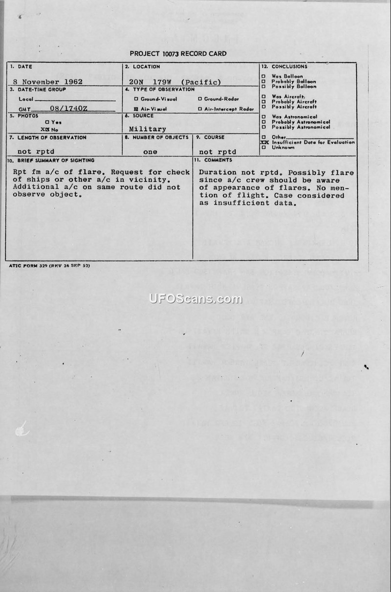 A military aircraft reported a flare-like object in the Pacific on 8 November 1962. The case was closed as insufficient data after no other aircraft in the area confirmed the sighting.