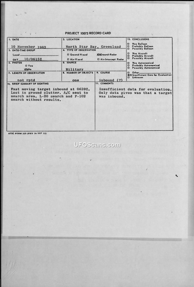 On 10 November 1962, a CIRVIS report was filed regarding an unidentified fast-moving target detected by radar in the North Star Bay area of Greenland. The target was first noted at 0639Z, with a magnetic bearing of 280 degrees, and was described as inbound. The target was subsequently lost in ground clutter at a range of 3 miles magnetic west. Following the initial detection, military authorities initiated search operations. At 1130Z, an L-20 aircraft searched an area approximately 45 nautical miles from Cape Athol with negative results. Later, at 1300Z, two F-102 aircraft conducted a search of a 1000 square mile area, also without success. A final search was conducted at 1630Z by an L-20 aircraft on a bearing of 275 degrees from Cape Athol at an altitude of 800 feet, which also failed to sight the target. The official conclusion recorded on the Project 10073 record card is that there was insufficient data for evaluation, noting that the only information provided was that a target was inbound.