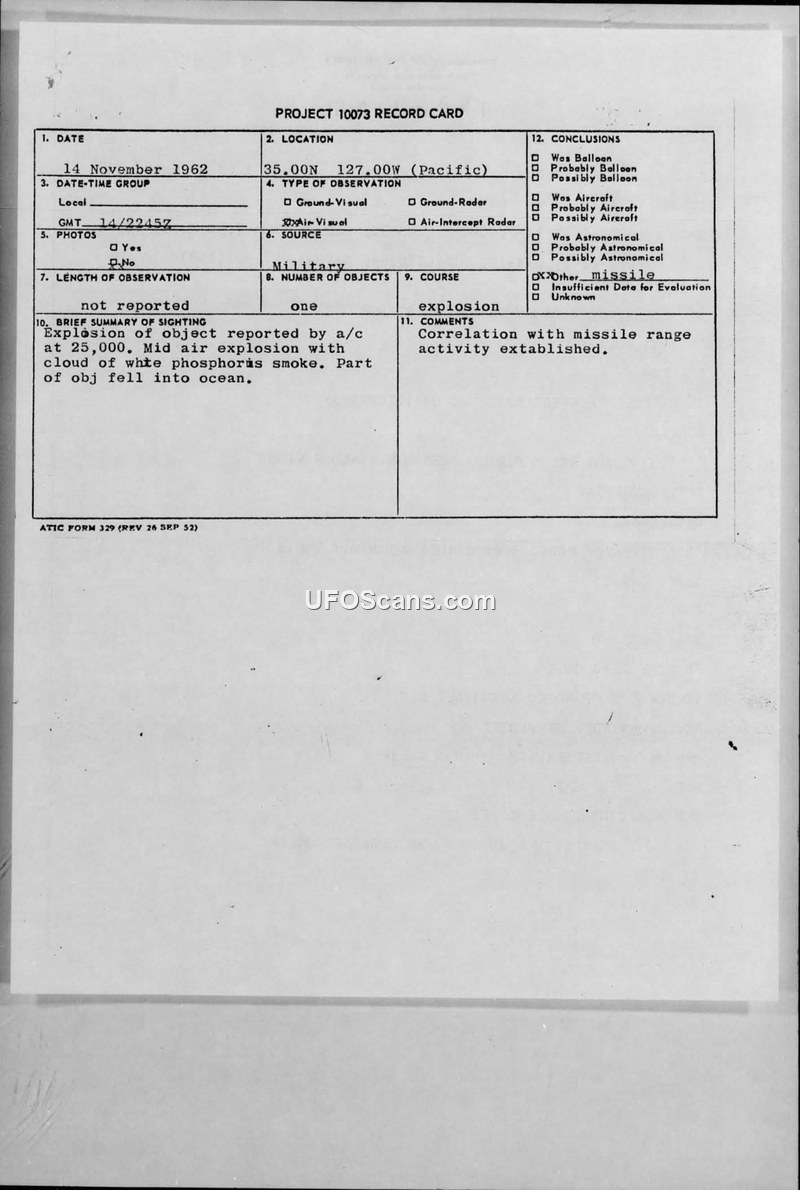 On 14 November 1962, at 2245Z, 1st Lt. Georg D. Wilson of the U.S. Air Force reported an incident involving an unidentified flying object at coordinates 35.00N 127.00W in the Pacific Ocean. The report, filed under the CIRVIS (Communication Instructions for Reporting Vital Intelligence Sightings) system, described a mid-air explosion of an object at an altitude of 25,000 feet. The explosion produced a cloud of white phosphorus smoke, and witnesses observed parts of the object falling into the ocean. The incident was documented on a Project 10073 record card. Following the report, an evaluation was conducted by MCCL AERO CALIF on 15 November 1962. The official conclusion reached was that the sighting posed no threat and was directly correlated with ongoing Pacific Missile Range activity. The documentation includes the original CIRVIS message and subsequent administrative routing notes confirming the distribution of the evaluation to relevant agencies, including CIN, DIA, and OOP-CP.