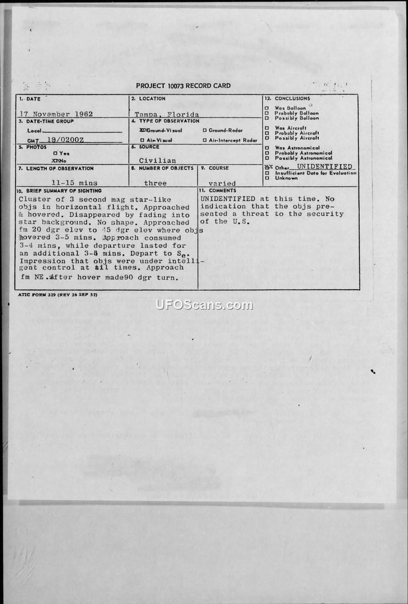 Project 10073 Record Card — Tampa, Florida, 17 November 1962