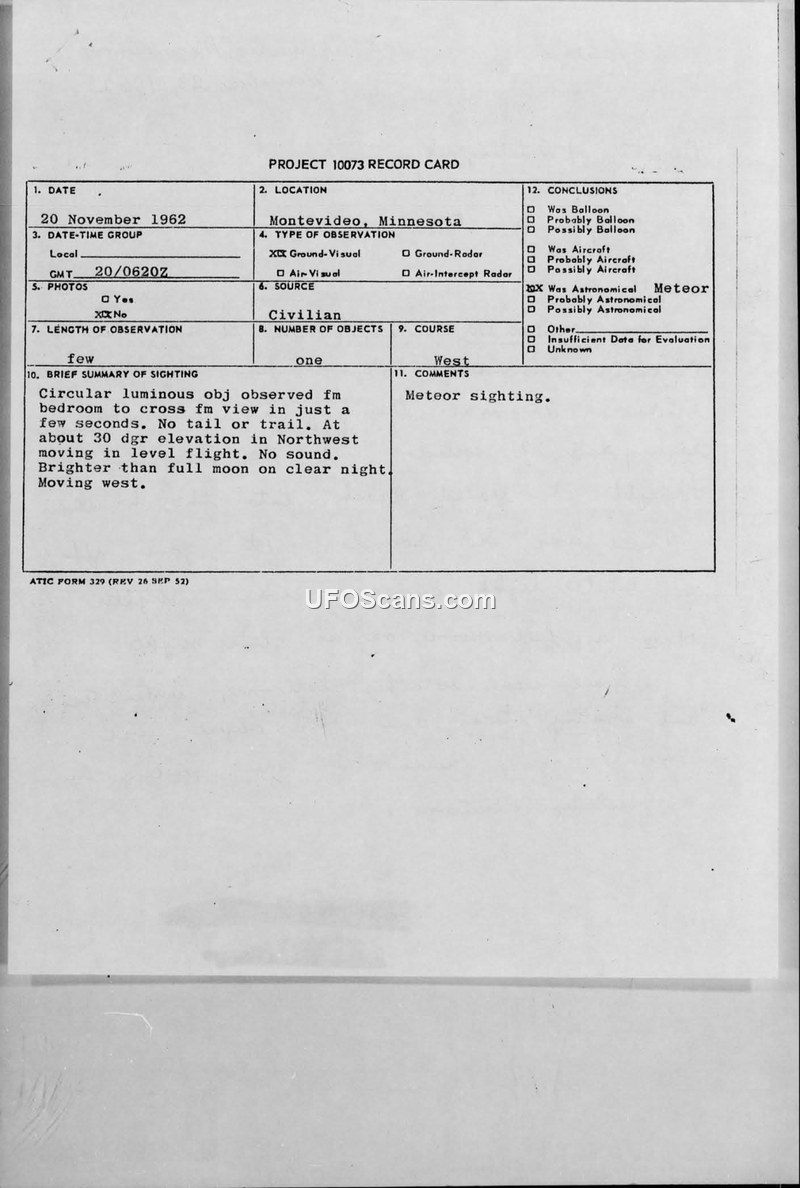 Project 10073 Record Card — Sighting of 20 November 1962, Montevideo, Minnesota