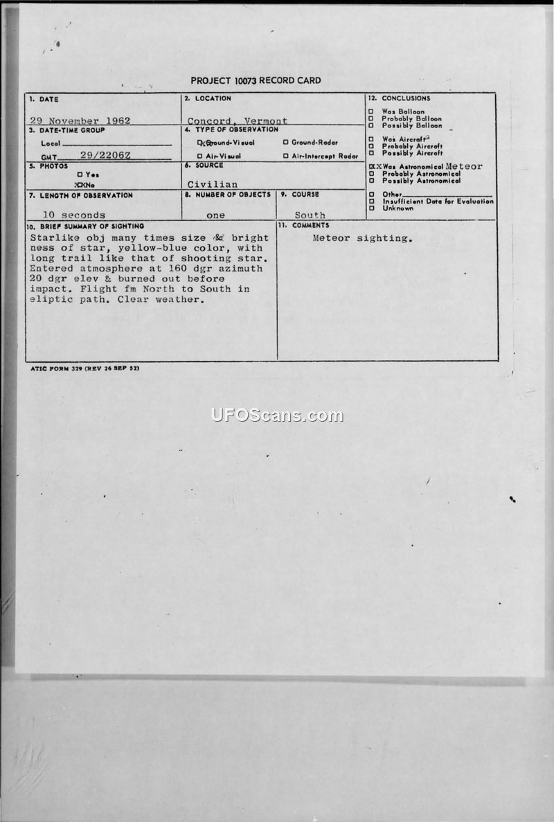 A civilian in Concord, Vermont, reported a starlike object on 29 November 1962. The Air Force investigation concluded the object was an astronomical meteor.