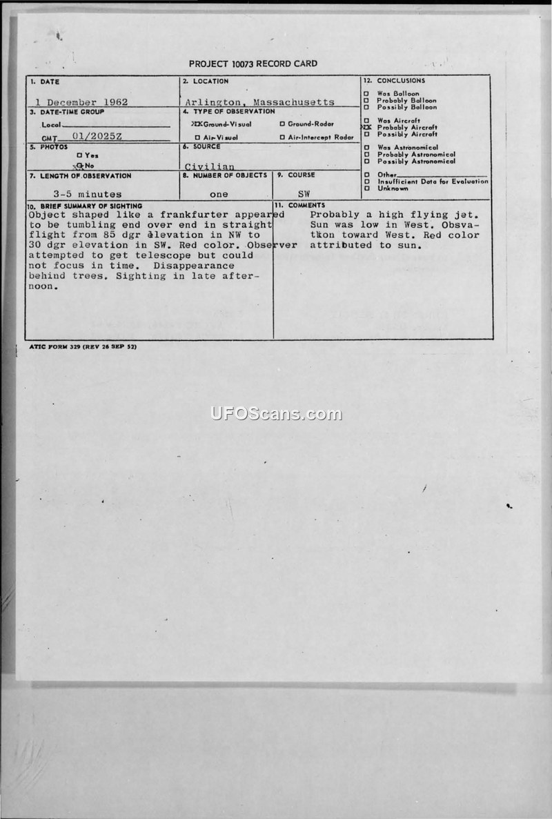 On 1 December 1962, a student in Arlington, Massachusetts, observed an unidentified object in the late afternoon sky. The witness described the object as oblong, shaped like a frankfurter, and red in color. The object was observed for approximately three to five minutes, during which it appeared to be tumbling end over end while maintaining a straight flight path. The witness attempted to use a 30-power telescope to view the object but was unable to focus in time before the object disappeared behind trees. The observer noted that the object appeared to be about the size of a 1/16-inch screw when held at arm's length. The weather conditions were reported as clear with CAVU (Ceiling and Visibility Unlimited) visibility. A follow-up investigation conducted by the Base Operations Division concluded that the sighting was likely a high-flying jet, with the red coloration attributed to the low position of the sun in the west. Major Kenneth J. Benoit of the USAF forwarded the reports to AFSC (FTD) at Wright-Patterson AFB, noting that further investigation failed to yield additional information.