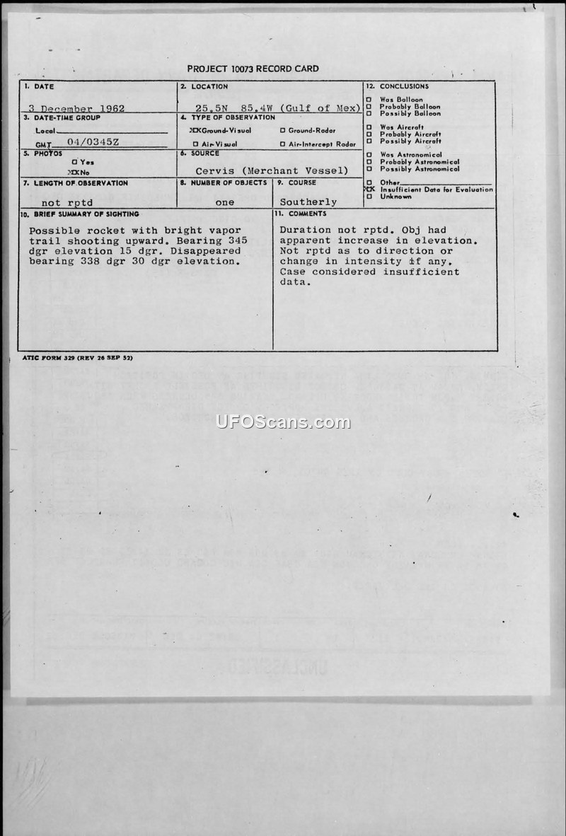 On 3 December 1962, at 0345Z, the merchant vessel SS Esso Lima reported a sighting of an Unidentified Flying Object (UFO) while located at coordinates 25.5N, 85.4W in the Gulf of Mexico. The report was transmitted via the CIRVIS (Communication Instructions for Reporting Vital Intelligence Sightings) system. The object was described as a possible rocket, characterized by a bright vapor trail that was observed shooting upward. Initial observations placed the object at a bearing of 345 degrees and an elevation of 15 degrees above the horizon. The object was subsequently observed to disappear at a bearing of 338 degrees and an elevation of 30 degrees. The report noted an apparent increase in the object's elevation during the observation. The duration of the sighting was not reported, and there was no information provided regarding changes in intensity or direction. The incident was documented on a Project 10073 record card and disseminated through multiple military channels, including CINCNORAD, the Air Force, and various naval commands. Following an evaluation by the Air Technical Intelligence Center (ATIC), the case was officially classified as having insufficient data for a definitive evaluation.
