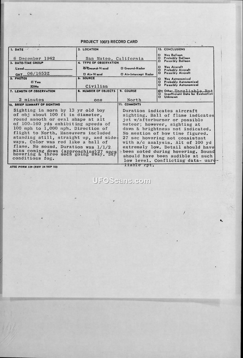 PROJECT 10073 RECORD CARD - San Mateo, California - 6 December 1962