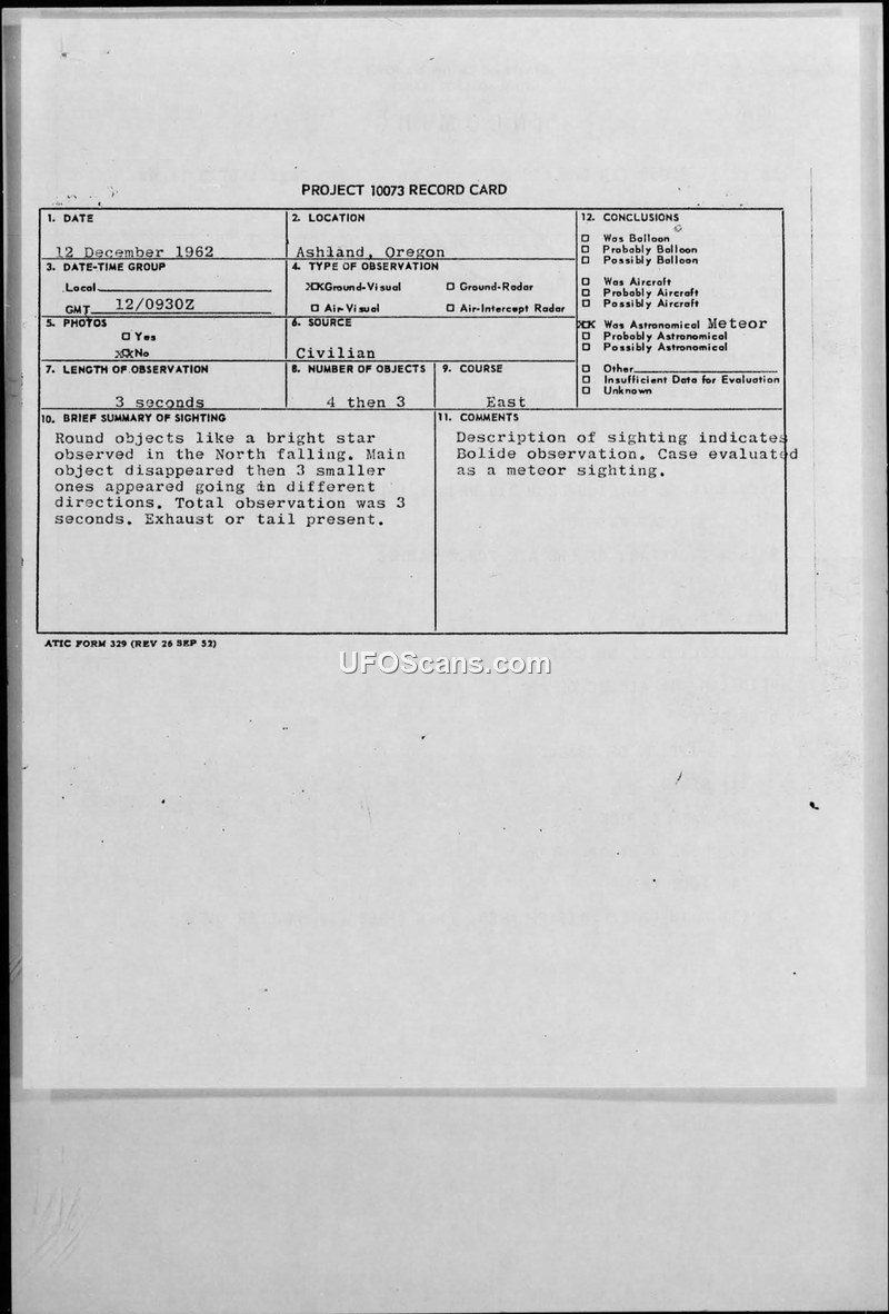 Project 10073 Record Card — Ashland, Oregon, 12 December 1962