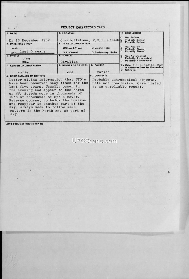 A civilian report from Charlottetown, Canada, detailing multiple UFO sightings between 1957 and 1962. The military evaluated the report as unreliable and likely astronomical in nature.