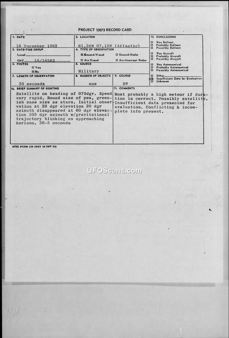 A military sighting report from 1962 detailing a visual observation of a greenish, round object in the Atlantic. The investigation concluded there was insufficient data to identify the object, suggesting it was likely a meteor or satellite.