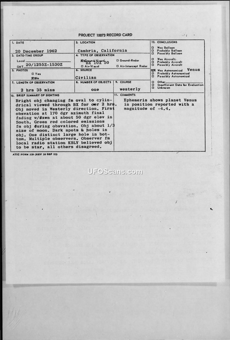On December 20, 1962, multiple civilian observers in Cambria, California, reported a bright, luminous object in the sky. The sighting began at approximately 12:55Z and lasted for two hours and thirty-five minutes, ending as the object faded with the arrival of daylight. Witnesses described the object as changing shape from spherical to oval and cigar-shaped, with a serrated border and dark spots or holes. One witness, a commercial photographer, noted a green field surrounding the object and red emissions. The observers were initially awakened by a bright light, though there was some disagreement among them regarding whether a sound had also occurred. The object was observed to move in a westerly direction, maintaining a position relative to the moon. The Air Force investigation, documented in a staff message and a Project 10073 record card, concluded that the object was the planet Venus, which was in the reported position with a magnitude of -4.4. While one observer from a local radio station initially suggested the object was a star, the official conclusion attributed the sighting to the planet Venus.