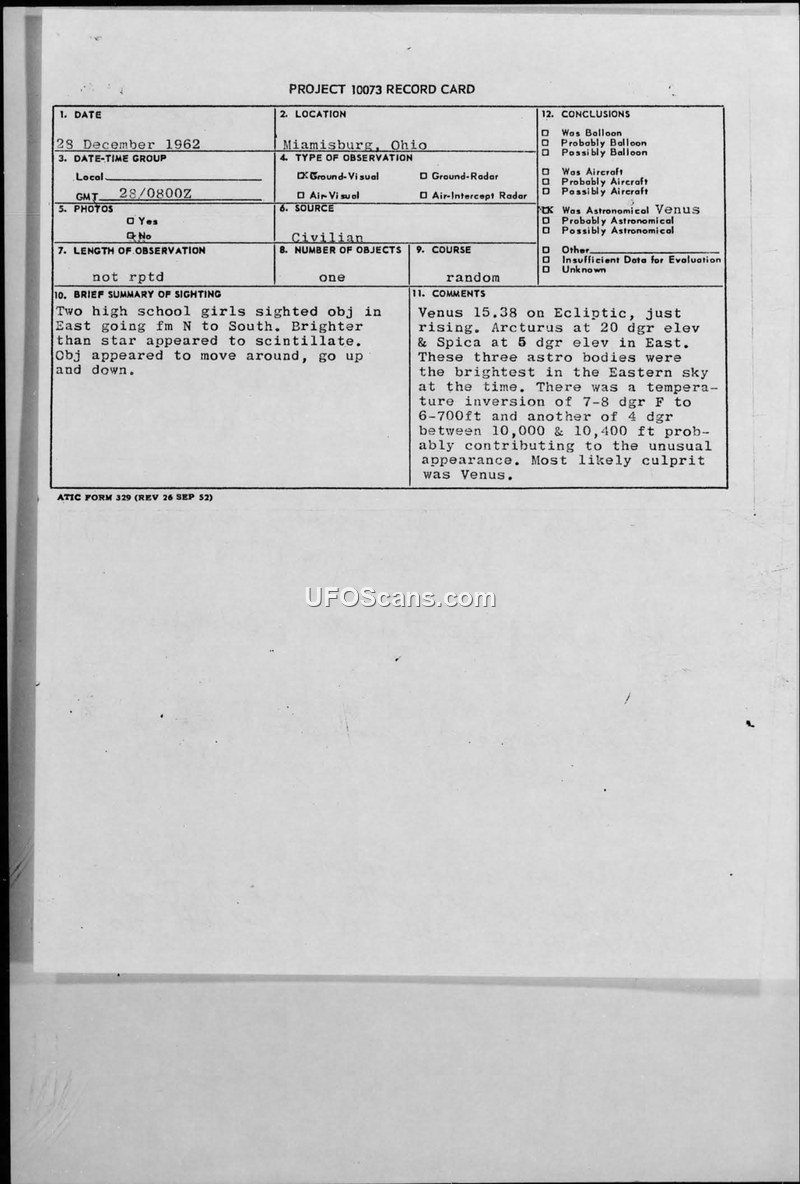PROJECT 10073 RECORD CARD — Miamisburg, Ohio, 23 December 1962