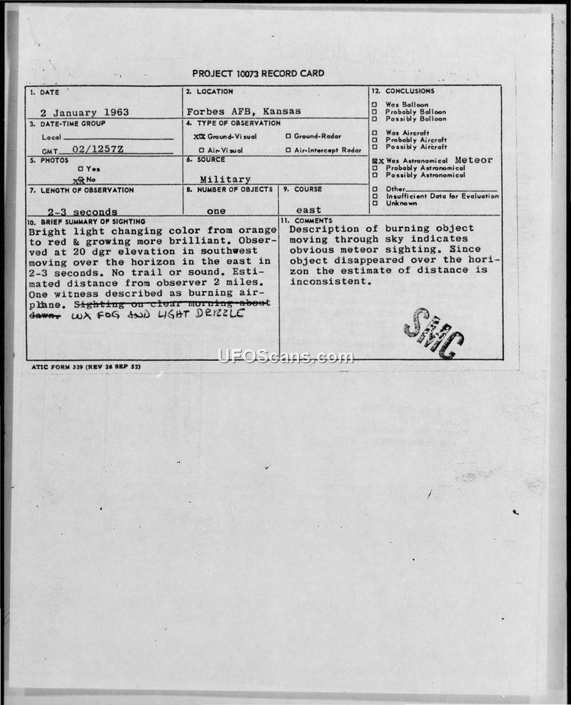 Project 10073 Record Card and Correspondence — Forbes AFB, Kansas, 2 January 1963