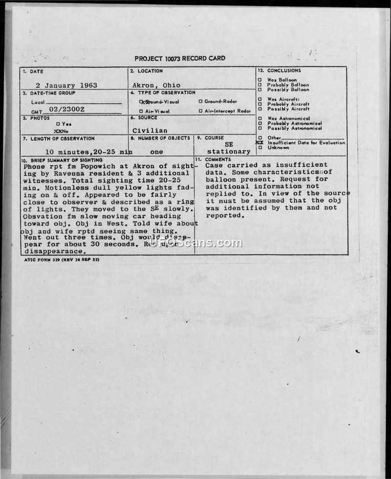 Project 10073 Record Cards and Memorandum for the Record — Akron and Ravenna, Ohio, January 1963