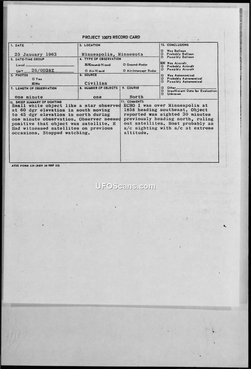 A radio announcer in Minneapolis reported a star-like object moving north on January 25, 1963. Military investigators ruled out the ECHO I satellite and concluded the object was likely an aircraft at extreme altitude.