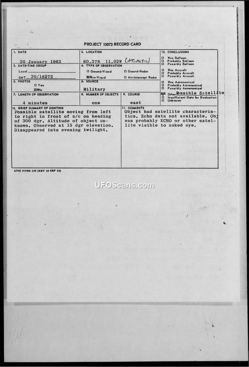 On 30 January 1963, at 1827Z, a sighting of an unidentified object occurred at coordinates 60.37N 11.02W in the Atlantic Ocean. The object was observed for four minutes by military personnel. It was described as a round, white object, appearing like the head of a pin, moving from left to right across the sky at a constant elevation of 15 degrees above the horizon. The object's flight path was noted as moving from 200 degrees to 230 degrees. The sighting occurred during evening twilight, and the object eventually disappeared. The report was processed through several military channels, including NORAD and the Department of the Air Force. Initial assessments considered the object a natural phenomenon, but subsequent evaluation suggested it possessed satellite characteristics. It was concluded that the object was likely the ECHO satellite or another similar satellite visible to the naked eye. Due to this assessment, further investigation into the incident was discontinued.