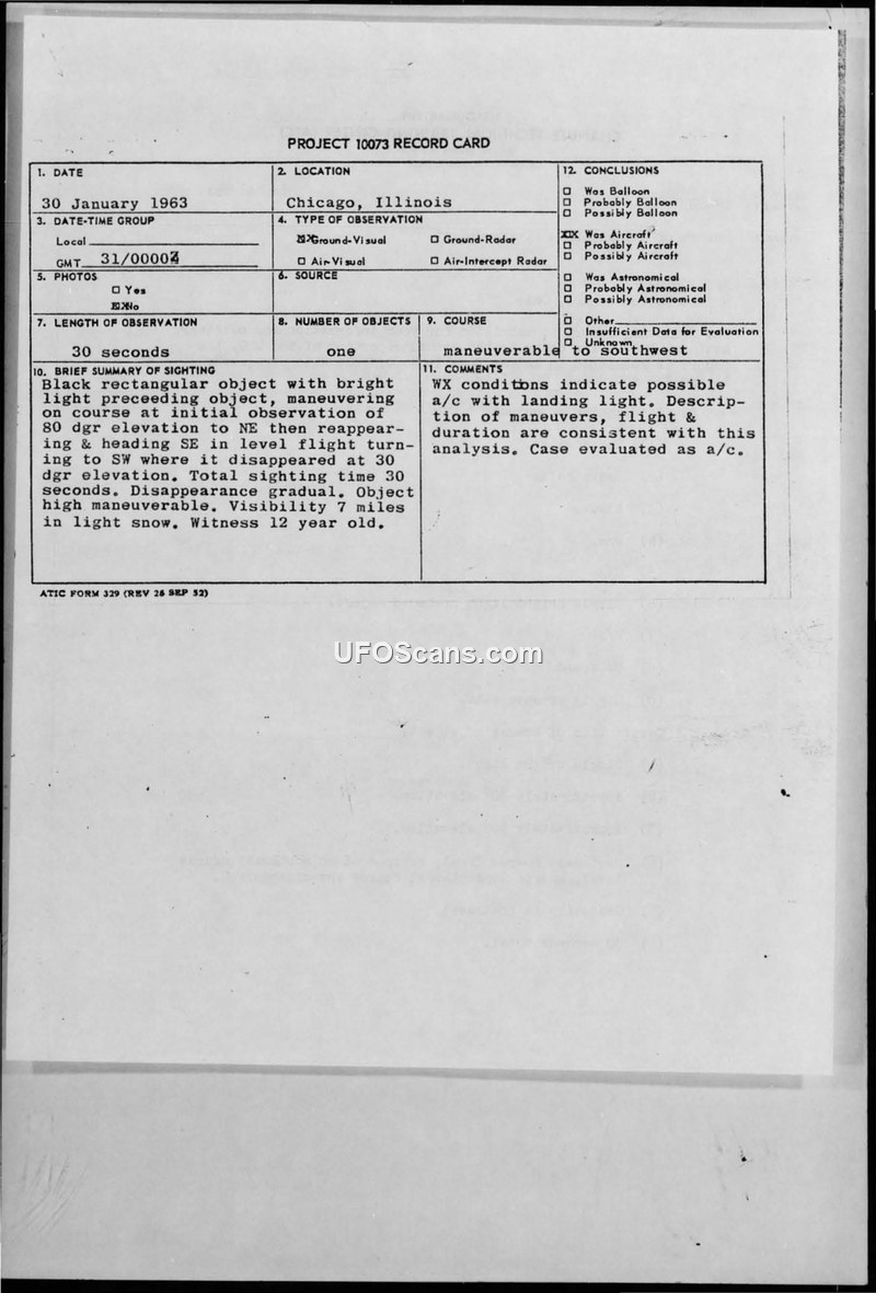Project 10073 Record Card and Report of Unidentified Flying Object — Chicago, Illinois, 31 January 1963