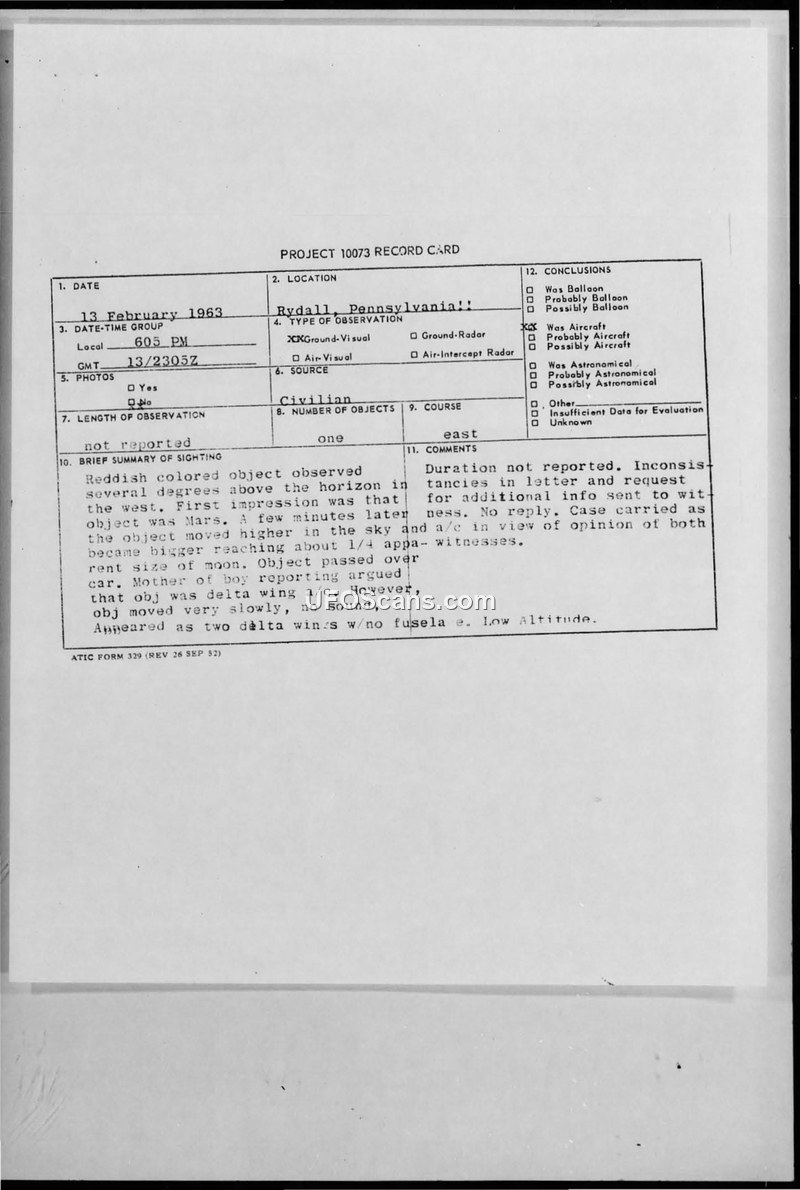 Project 10073 Record Card — Rydall, Pennsylvania, 13 February 1963