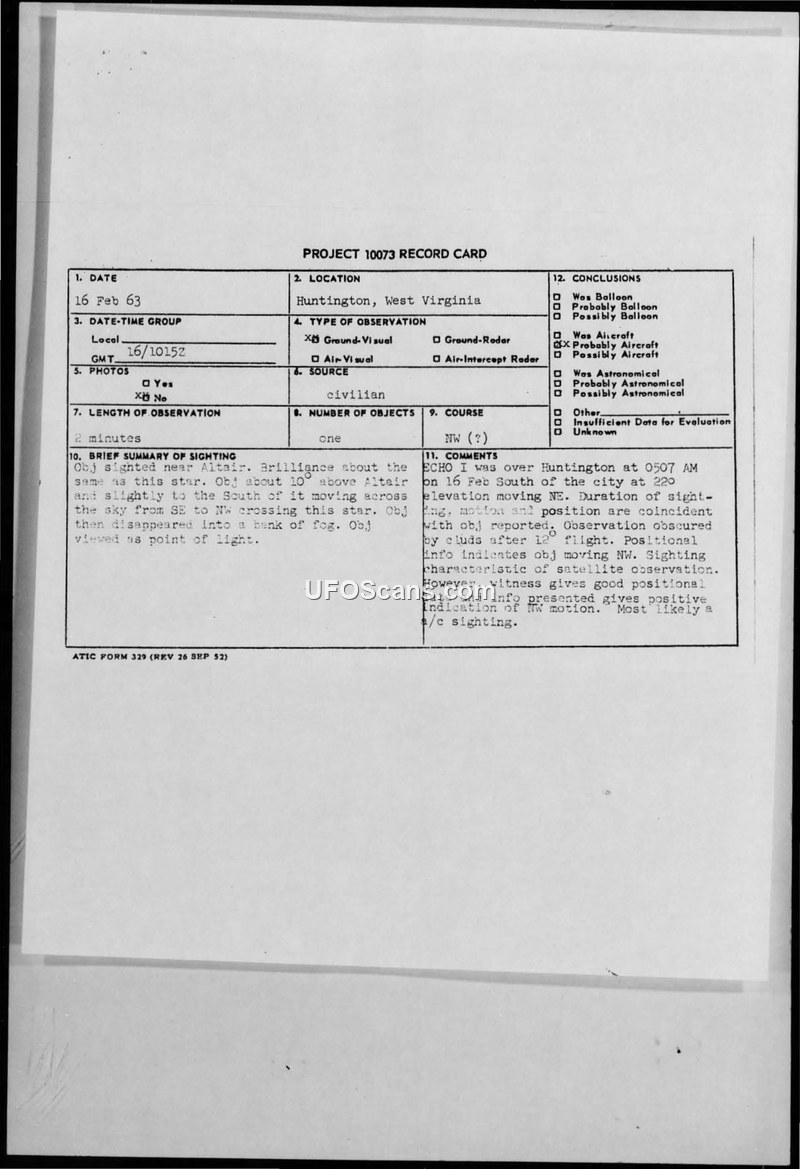 PROJECT 10073 RECORD CARD — Huntington, West Virginia, 16 Feb 63