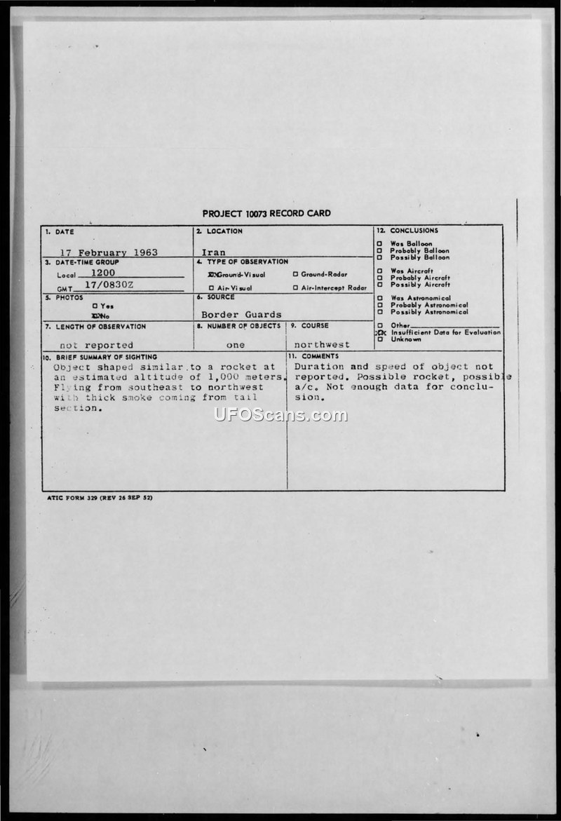 Iranian border guards reported a rocket-shaped object with thick smoke trailing from its tail on 17 February 1963. Military intelligence concluded there was insufficient data to identify the object.