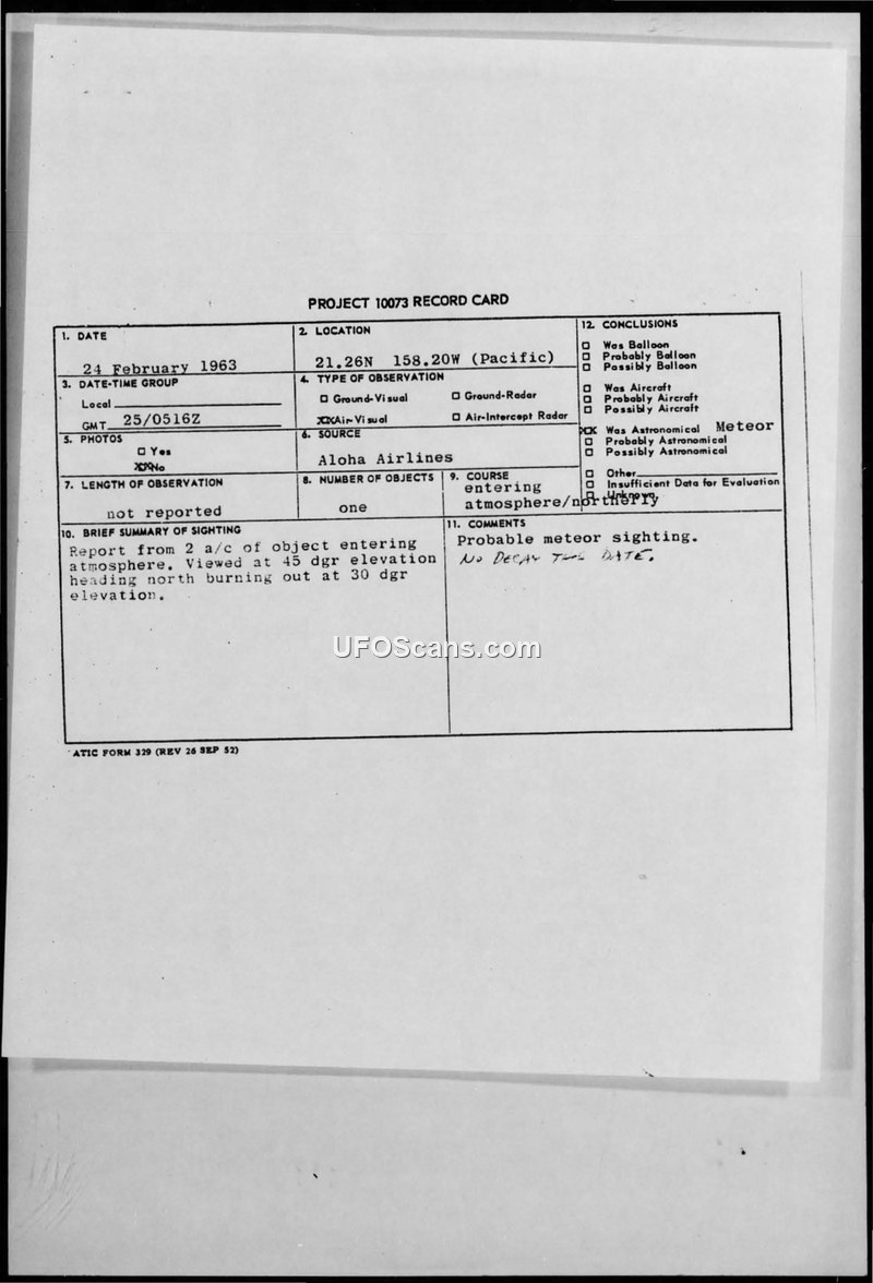 On 24 February 1963, at 0516Z, two Aloha Airlines aircraft reported observing a brilliant white object entering the atmosphere. The sighting occurred at coordinates 21.26N 158.20W in the Pacific region near Hawaii. The object was described as traveling at high speed on a northerly trajectory. It was initially observed at an elevation of 45 degrees and was noted to burn out at an elevation of 30 degrees. The sighting was confirmed by two separate Aloha Airlines aircraft, specifically identified in the message as aircraft 731 and aircraft 131. The incident was reported via a CIRVIS (Communication Instructions for Reporting Vital Intelligence Sightings) message. The official conclusion recorded on the Project 10073 record card is that the event was a probable meteor sighting.