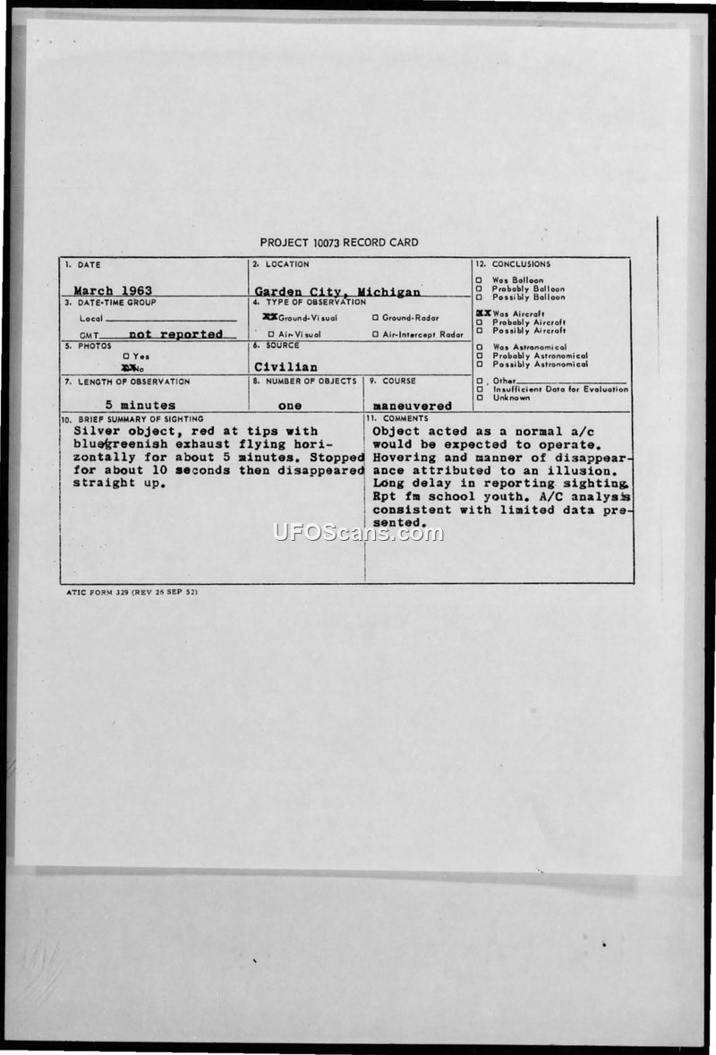 A 1963 UFO sighting report from Garden City, Michigan, was evaluated by the U.S. Air Force as a conventional aircraft. The Air Force dismissed the report due to the delay in filing and maintained their stance that UFOs are not evidence of extraterrestrial technology.
