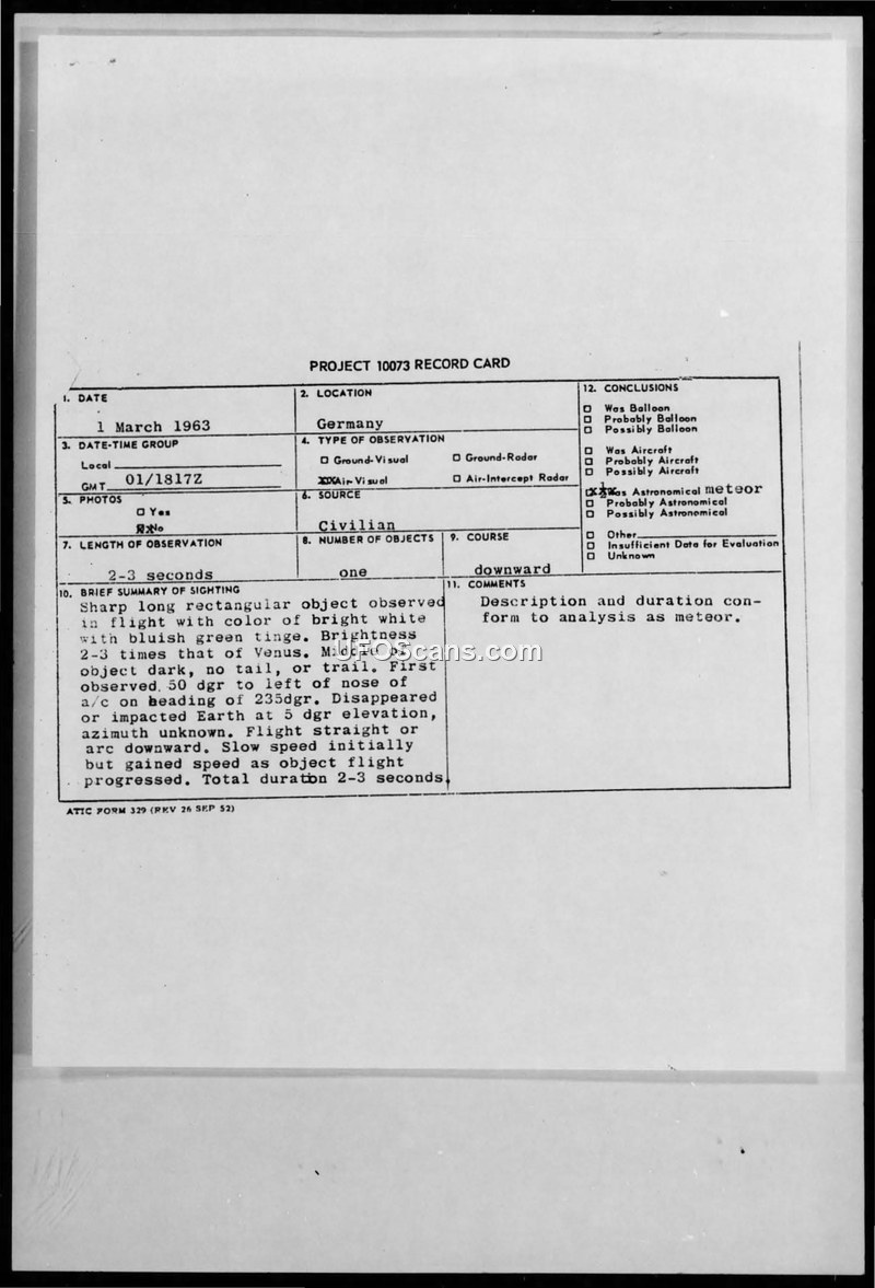 Project 10073 Record Card — Sighting Report 1 March 1963, Germany