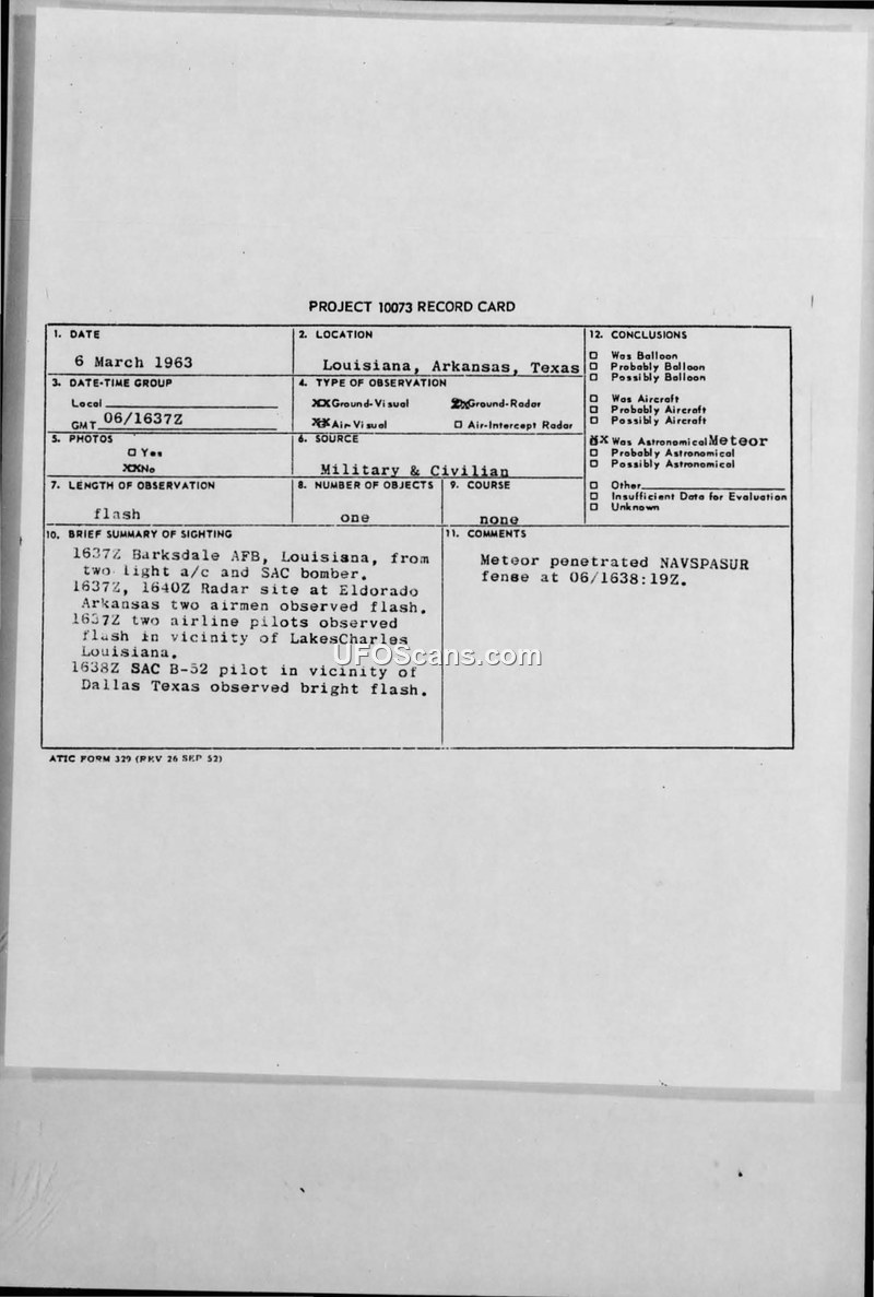 On 6 March 1963, multiple reports of a bright flash were recorded across Louisiana, Arkansas, and Texas. The sightings occurred around 1637Z and involved various observers, including personnel at Barksdale AFB, a SAC bomber crew, radar sites at Eldorado, Arkansas, airline pilots near Lake Charles, Louisiana, and a SAC B-52 pilot flying west of Dallas, Texas. The reports were consolidated into a Project 10073 record card and followed up by operational immediate messages between military commands, including FTD, NORAD, and AFSC. NAVSPASUR reported a penetration of its fence at 1638:19Z. Official analysis conducted by NORAD using SPADATS data concluded that there was no correlation with any catalogued foreign space objects. The event was officially attributed to the atmospheric entry and disintegration of a meteor or meteorite, specifically noting the presence of the recurring 'Virginids' meteor stream active during that period in March.