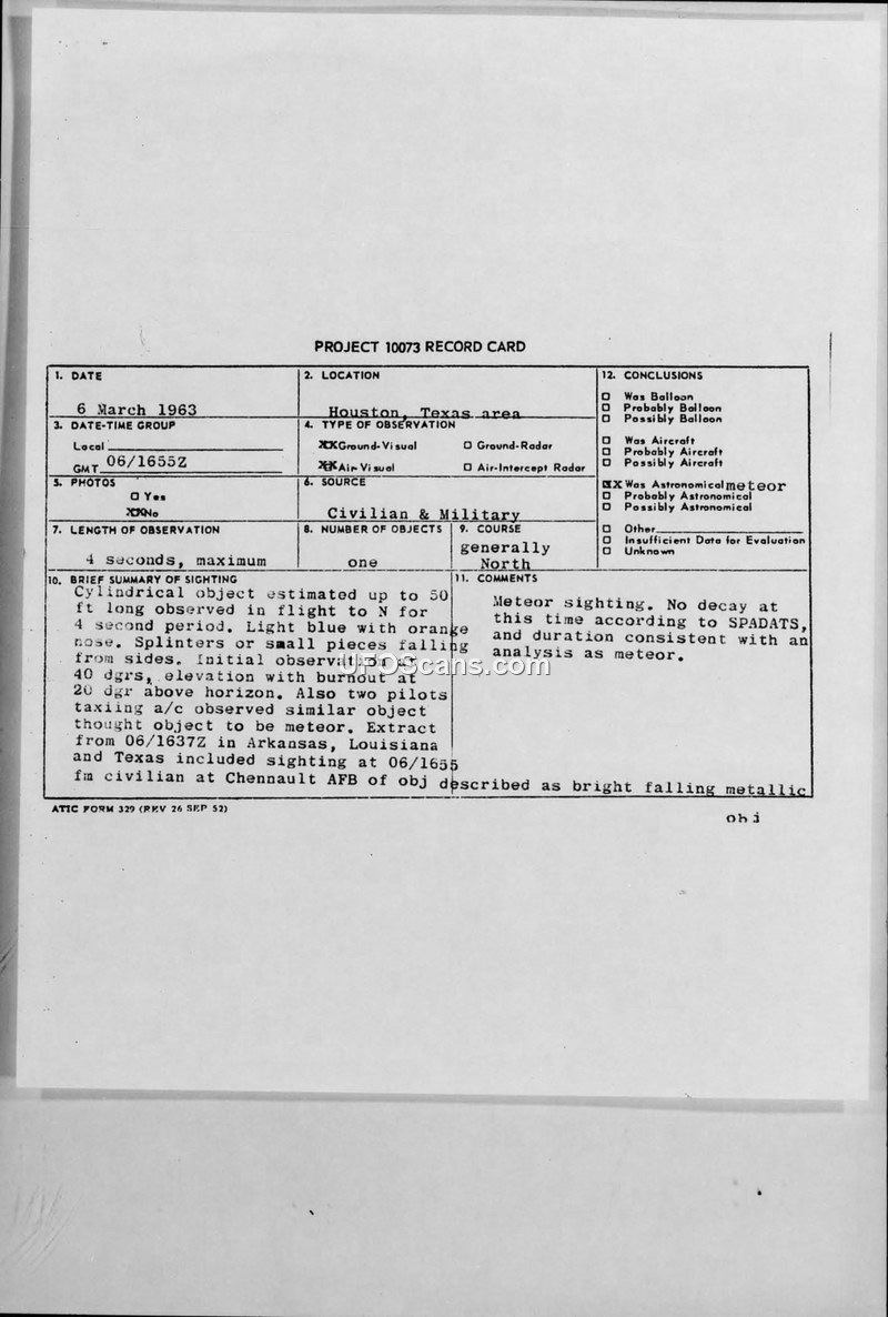 Project 10073 Record Card — Houston, Texas, 6 March 1963