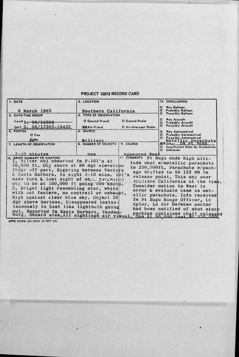 This document is a Project 10073 record card and associated correspondence regarding a UFO sighting on March 6, 1963, in Southern California. The military officially identified the object as a metallic parachute from a high-altitude test shot, though some discrepancies in the observation details were noted by the reporting officers.