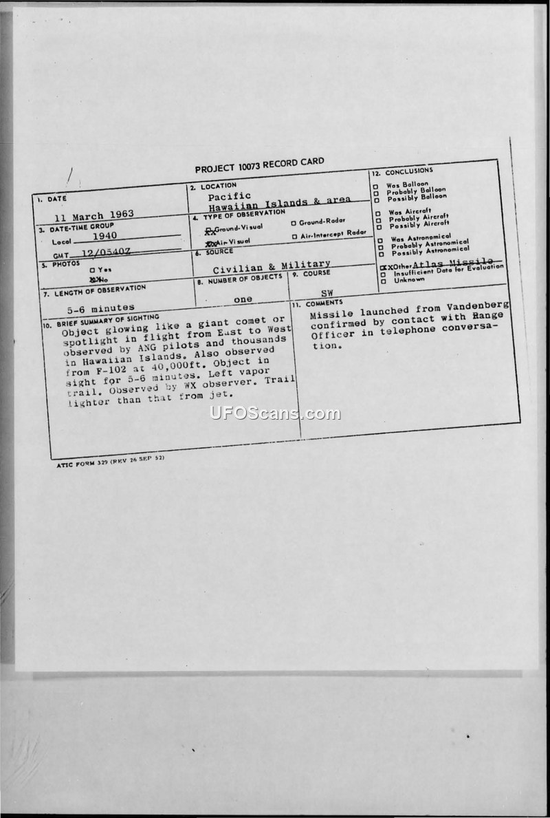 On the evening of March 11, 1963, a bright, crescent-shaped object was observed traveling from east to west over the Hawaiian Islands. The sighting was reported by thousands of residents and two Hawaii Air National Guard pilots who were flying at an altitude of 40,000 feet. Witnesses described the object as glowing like a giant comet or spotlight, noting that it left a vapor trail lighter than that of a jet. Some observers reported that the object appeared to be on fire and seemed to fall into the sea. A U.S. Weather Bureau observer, William Garr, likened the object to an inverted headlight. While the sighting initially baffled local pilots, FAA control-tower operators, and the public, the official conclusion recorded on the Project 10073 record card identified the object as a missile launched from Vandenberg Air Force Base, a fact confirmed through a telephone conversation with a Range Officer. Press reports from the time indicate that the incident caused significant public interest, with local newspapers and radio stations being flooded with calls.