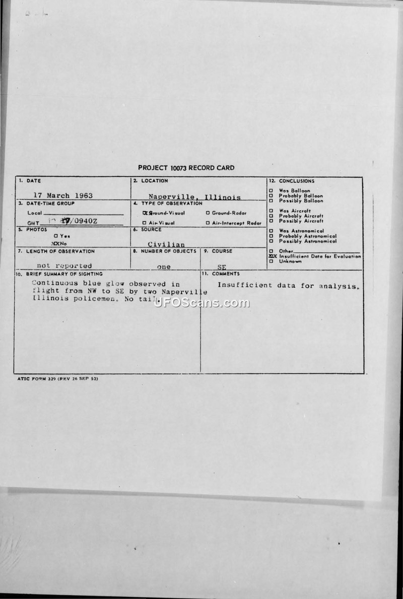On March 17, 1963, at 0940Z, two Naperville, Illinois, police officers observed an unidentified aerial phenomenon. The object was described as a continuous blue glow that lacked a tail. The object was observed in flight, traveling from the northwest to the southeast. This incident was documented on a Project 10073 record card and formally reported by Thomas A. Hilquist, Base Operations Officer of the 64th Troop Carrier Squadron, to the Foreign Technology Division at Wright-Patterson Air Force Base on March 21, 1963. The official conclusion reached by the Air Force was that there was insufficient data available to conduct a meaningful analysis of the sighting.