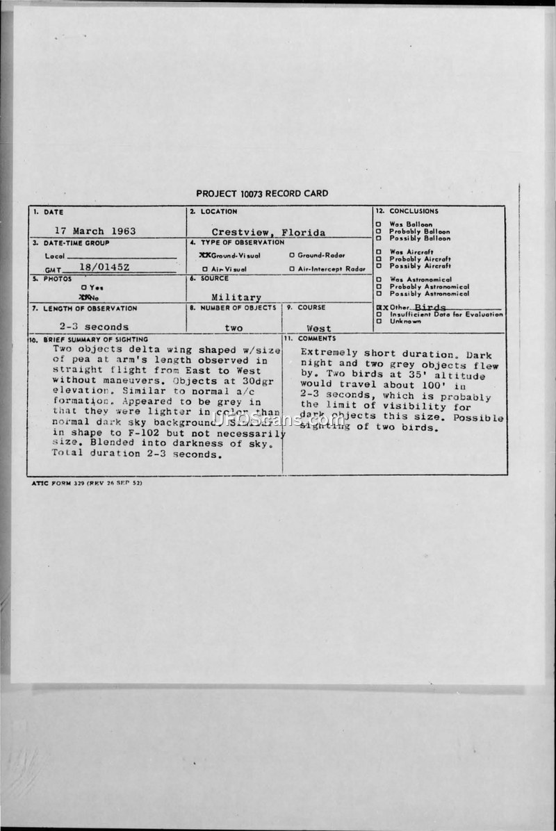 Project 10073 Record Card — Crestview, Florida, 17 March 1963