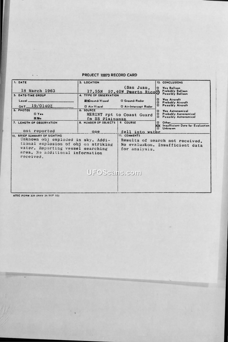 The SS Plainsman reported an unidentified object exploding in the sky and upon water impact near Puerto Rico on March 18, 1963. The Air Force recorded the event under Project 10073 but concluded there was insufficient data for analysis.