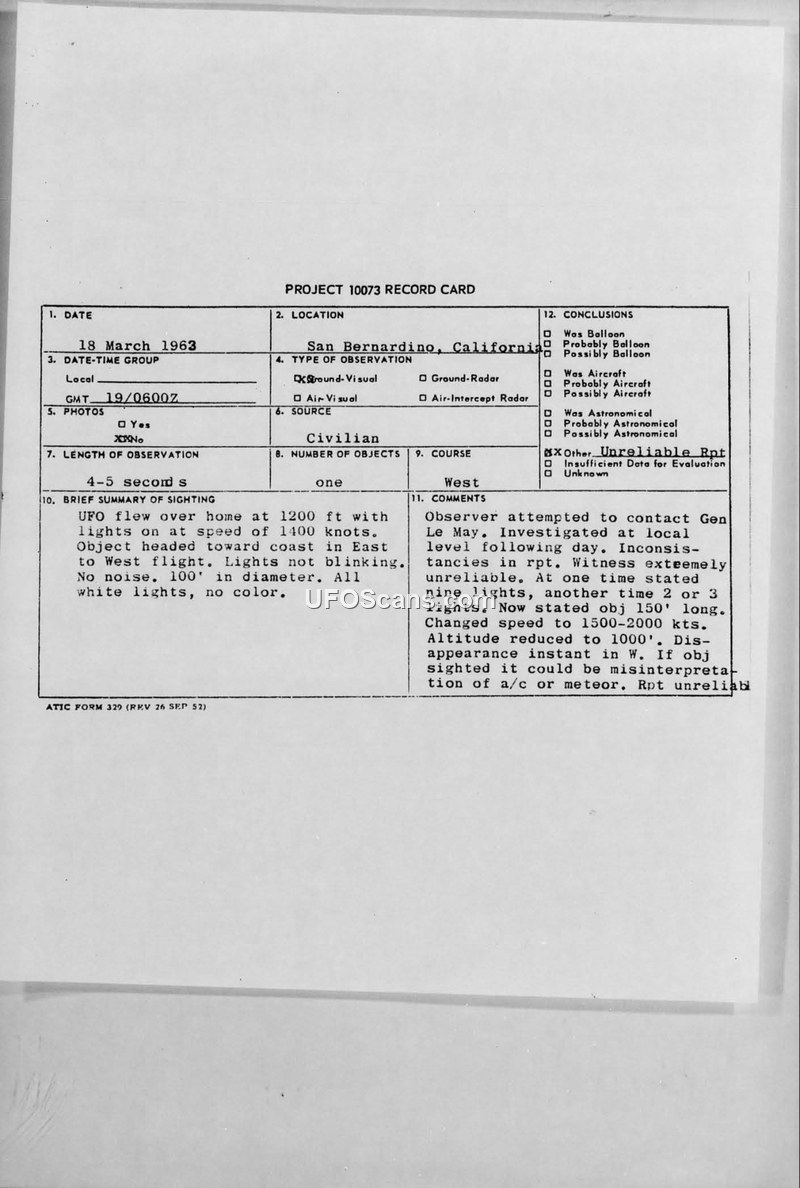 Project 10073 Record Card — San Bernardino, California, 18 March 1963