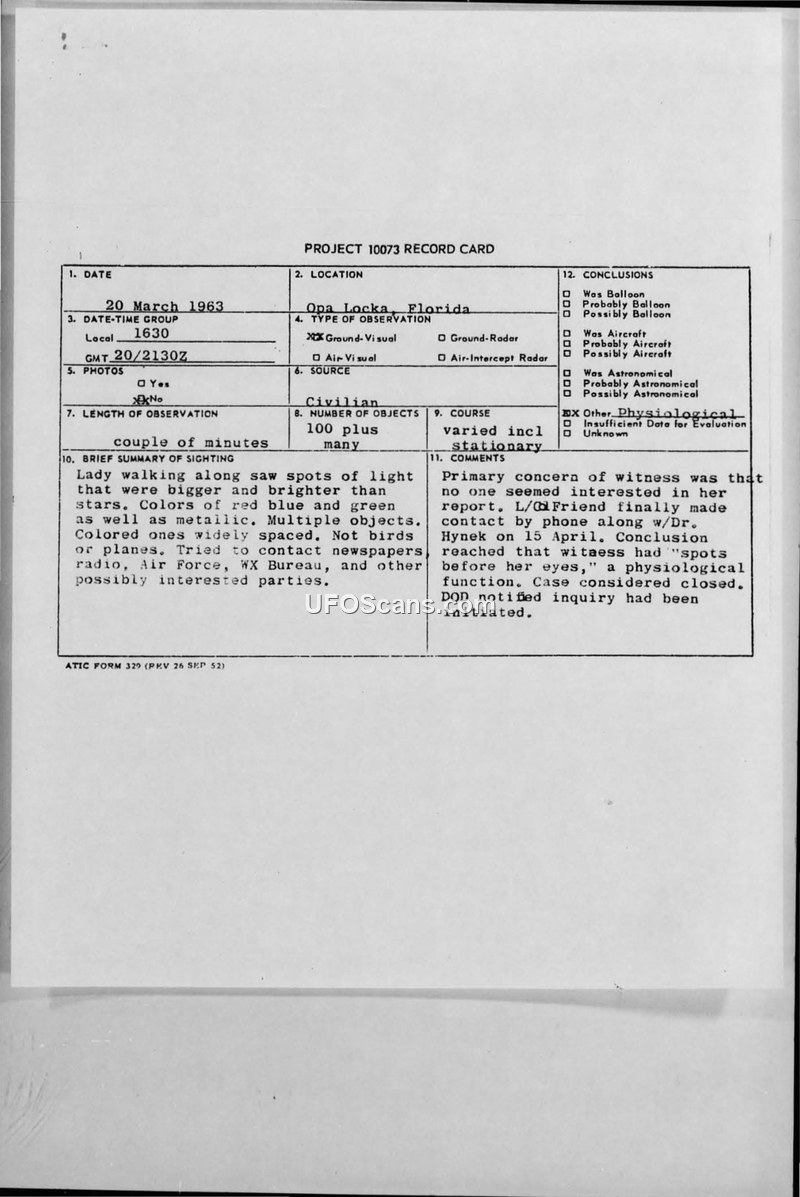On March 20, 1963, a civilian witness in Opa Locka, Florida, reported observing over 100 unidentified objects in the sky at approximately 16:30 local time. The witness described the objects as spots of light, larger and brighter than stars, exhibiting metallic surfaces and colors including red, blue, and green. The objects were reported to move from west to east, with some appearing to have a halo-like glow. The witness attempted to contact various entities, including the Miami Herald, the Richmond radar station, the weather bureau, and the Miami International Airport control tower, but felt ignored. She subsequently wrote to President John F. Kennedy to express her frustration regarding the lack of official interest in her report. The Air Force, through Major C. R. Hart, attempted to contact the witness to follow up on the report. Eventually, Dr. J. Allen Hynek and Lt. Col. Robert Friend spoke with the witness on April 15, 1963. Following this contact, the Air Force concluded that the witness had experienced a physiological phenomenon described as 'spots before her eyes.' The case was officially closed on April 23, 1963, with the Department of Defense notified that the inquiry had been initiated and subsequently resolved.