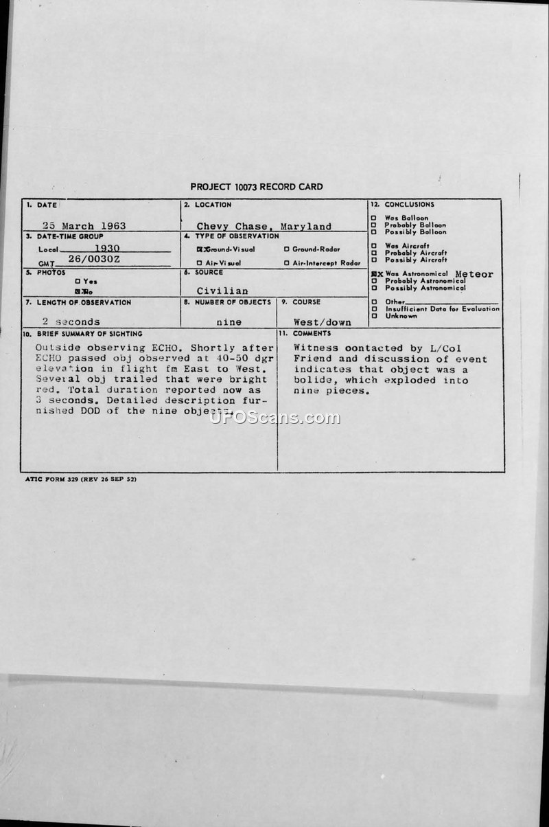 PROJECT 10073 RECORD CARD - 25 March 1963