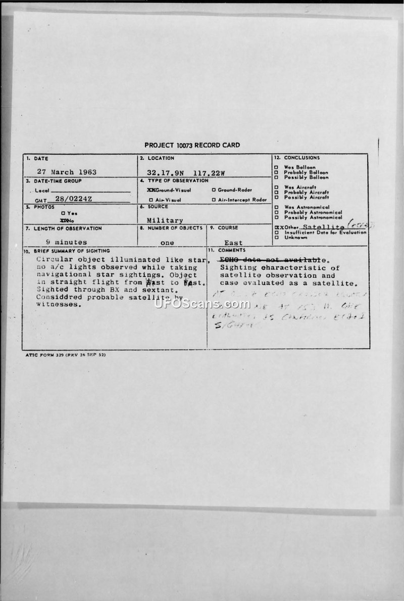 On 27 March 1963, at approximately 0224Z, the crew of the USS Sculpin observed an unidentified flying object while conducting navigational star sightings. The object was described as circular, appearing the size of a pinhead, and illuminated like a star with no visible aircraft lights. Three officers—LT Parks, LTJG Howse, and LT Akers—observed the object for a duration of nine minutes. The object followed a straight flight path from west to east, moving from an altitude of approximately 53 degrees to 30 degrees before disappearing behind a cloud. The observers utilized binoculars and a sextant during the sighting. LCDR R.W. Dickieson, the Commanding Officer of the USS Sculpin, evaluated the object as a probable satellite. The official Project 10073 record card confirms this classification, noting that the sighting characteristics were consistent with a satellite observation. A subsequent internal note from Major Quintanilla on 23 March 1964 acknowledged the classification but pointed out a discrepancy in the record card regarding the reported flight direction, noting that the original report correctly identified the path as west to east, whereas the card incorrectly stated east to west.