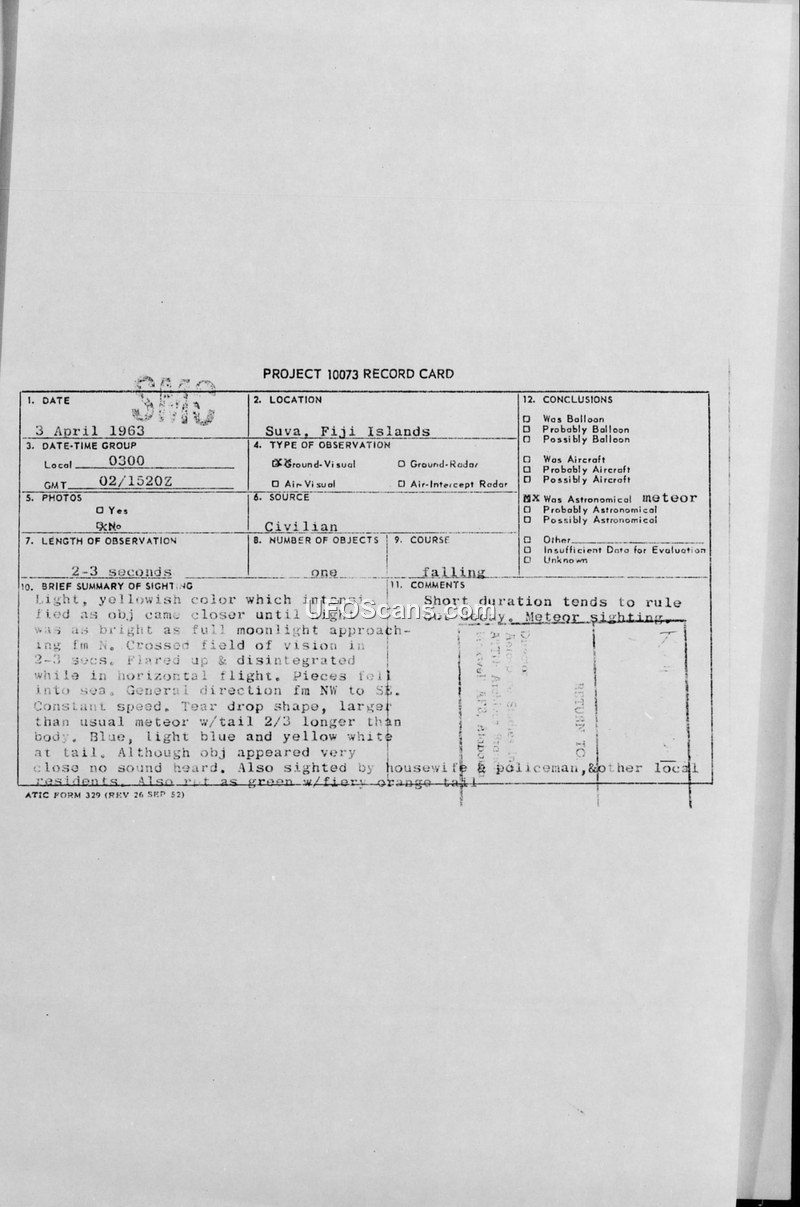 Project 10073 Record Card — Sighting in Suva, Fiji Islands, 3 April 1963