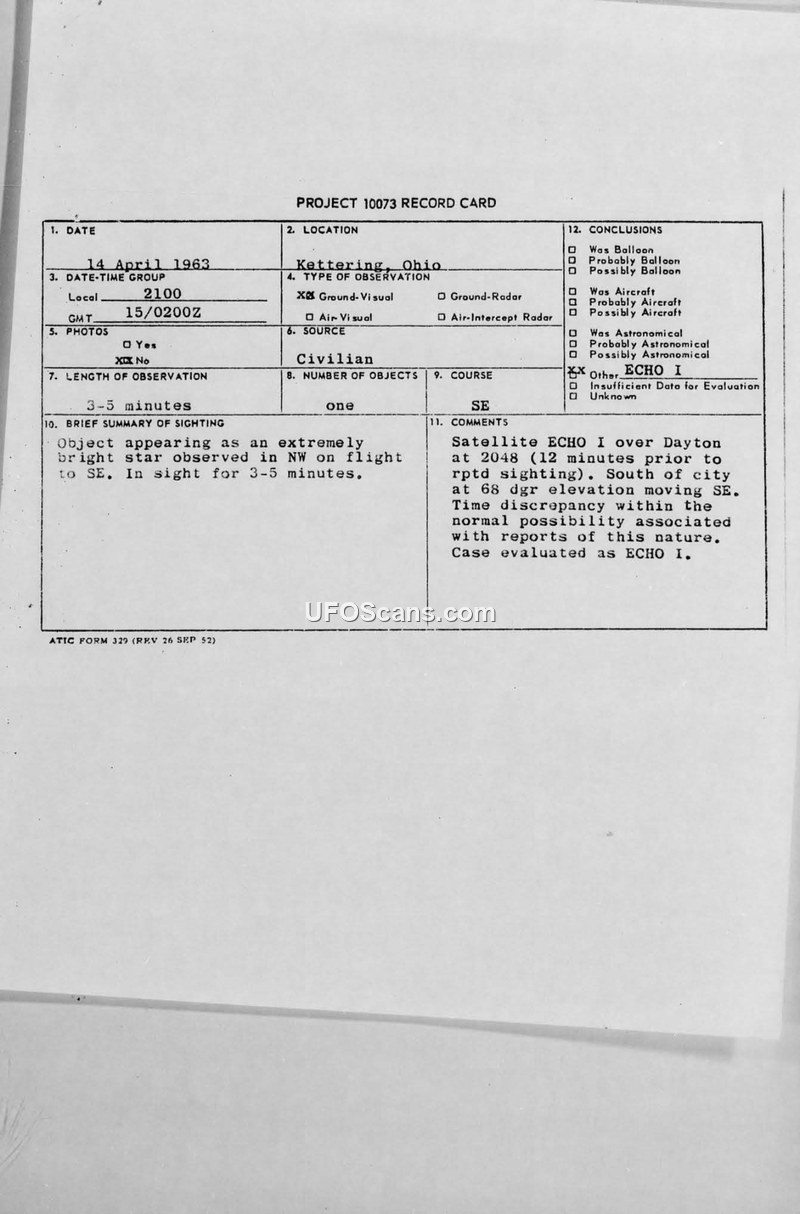 On April 14, 1963, a civilian witness in Kettering, Ohio, reported observing an unidentified aerial phenomenon. The witness described the object as appearing like an extremely bright star, which was visible for approximately three to five minutes. The object was first observed in the northwest and moved toward the southeast. The report was taken by Major Toombs of the FTD (Foreign Technology Division) on the same day. The official investigation, documented on a Project 10073 record card, concluded that the sighting was the satellite ECHO I. The investigators noted that the satellite was over Dayton at 2048 hours, which was twelve minutes prior to the reported sighting. Despite a slight time discrepancy, the evaluators determined this fell within the normal range of possibility for such reports and officially closed the case as an identification of the ECHO I satellite.
