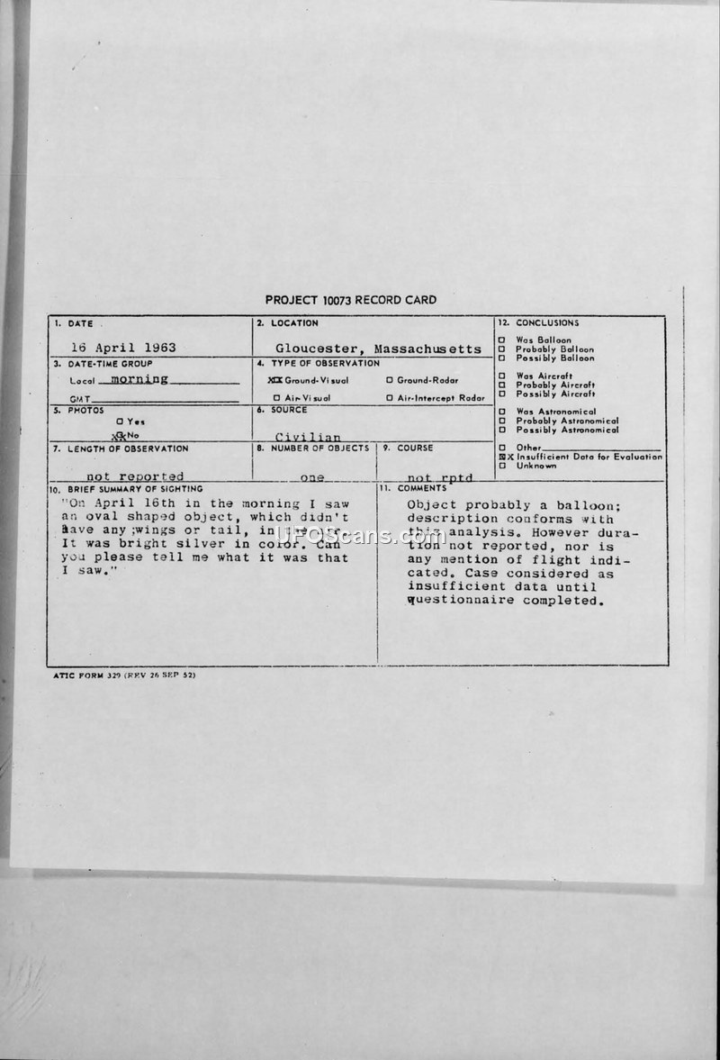 PROJECT 10073 RECORD CARD — Gloucester, Massachusetts, 16 April 1963