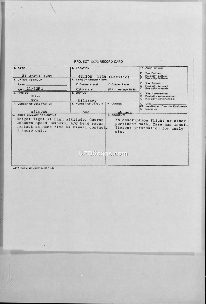 On 21 April 1963, a military aircraft reported a sighting of an unidentified aerial phenomenon in the Pacific region at coordinates 42.20N 173W. The object was described as a bright light at high altitude. The reporting aircraft maintained radar contact with the object at the same time as the visual contact, though the observation was limited to a brief glimpse. The incident was reported through the CIRVIS (Communication Instructions for Reporting Vital Intelligence Sightings) system and forwarded to CINCNORAD as an unknown contact. Subsequent evaluation by the Air Technical Intelligence Center (ATIC) concluded that the case lacked sufficient information for a definitive analysis, noting that there was no description of flight characteristics or other pertinent data available to support further investigation.