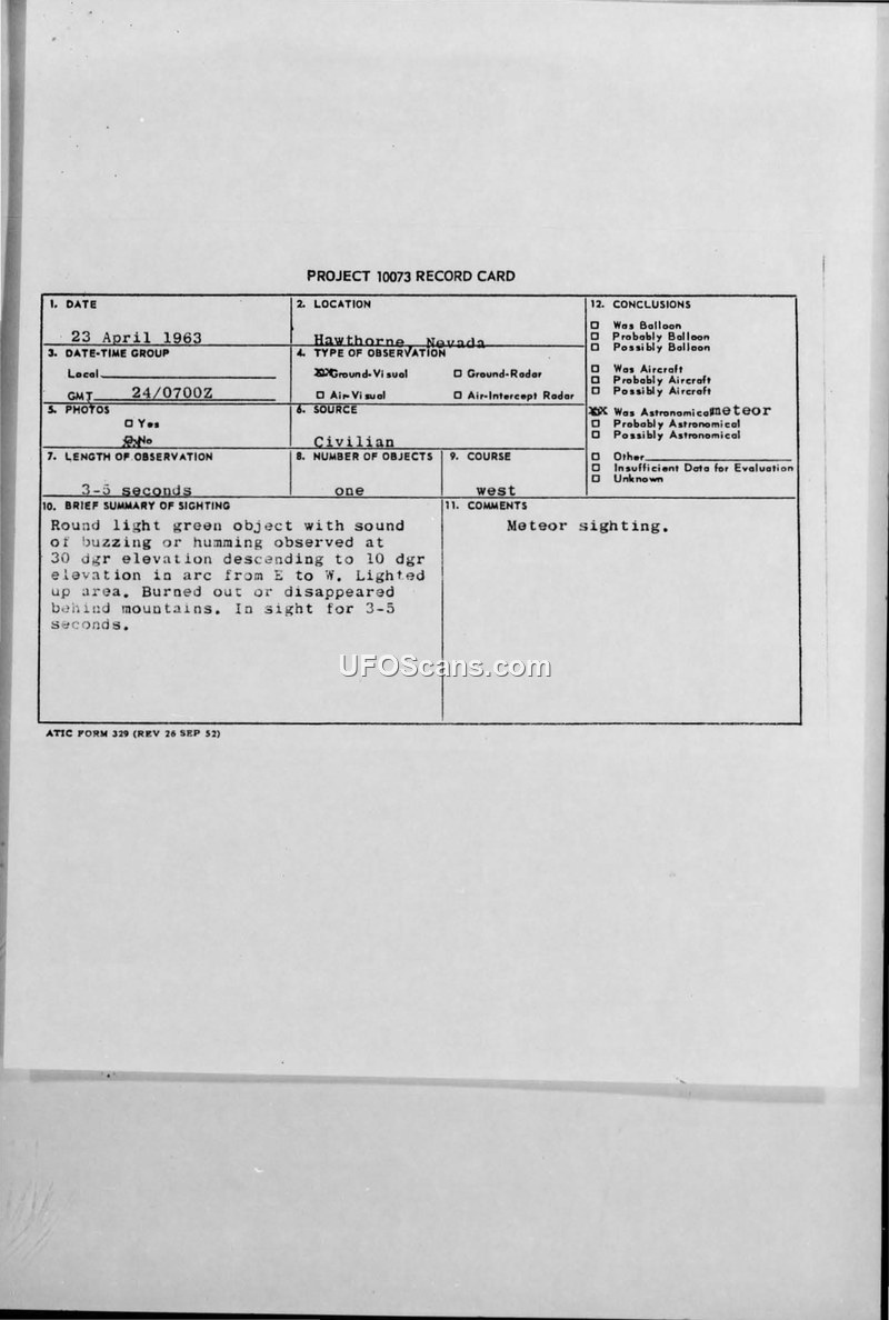 On 23 April 1963, a civilian witness reported a sighting of an unidentified aerial object near Hawthorne, Nevada. The incident occurred at approximately 0700Z. The witness described the object as a round, light-green, basketball-sized entity that emitted a buzzing or humming sound. The object was observed at an elevation of 30 degrees, descending in an arc from east to west until it reached an elevation of 10 degrees. During its transit, the object reportedly illuminated the surrounding area before either burning out or disappearing behind mountains. The entire observation lasted between three and five seconds. The location of the observer was noted as two miles south of Walker Lake, Hawthorne, Nevada. The report indicates that the area contained five million pounds of naval ammunition, and local police also received reports from other local civilians. The official conclusion reached by the investigating agency, ATIC, was that the event was a meteor sighting.