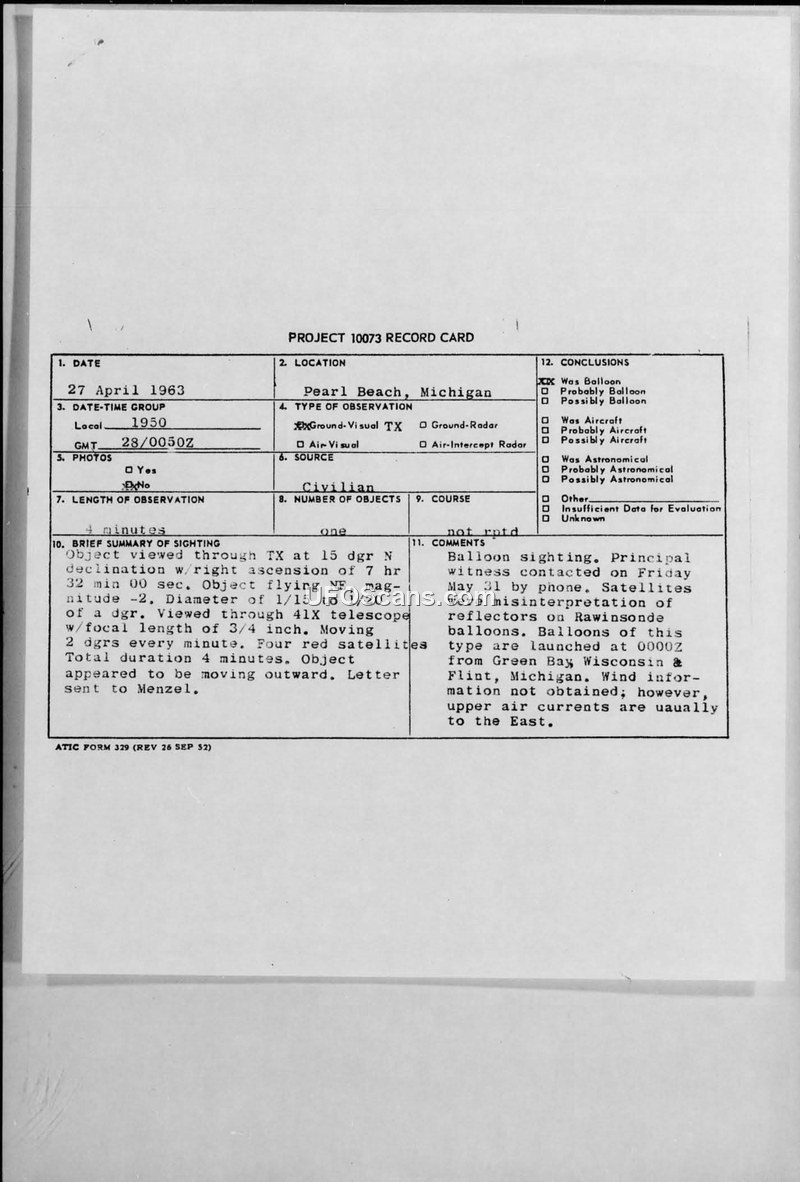 PROJECT 10073 RECORD CARD — Pearl Beach, Michigan, 27 April 1963