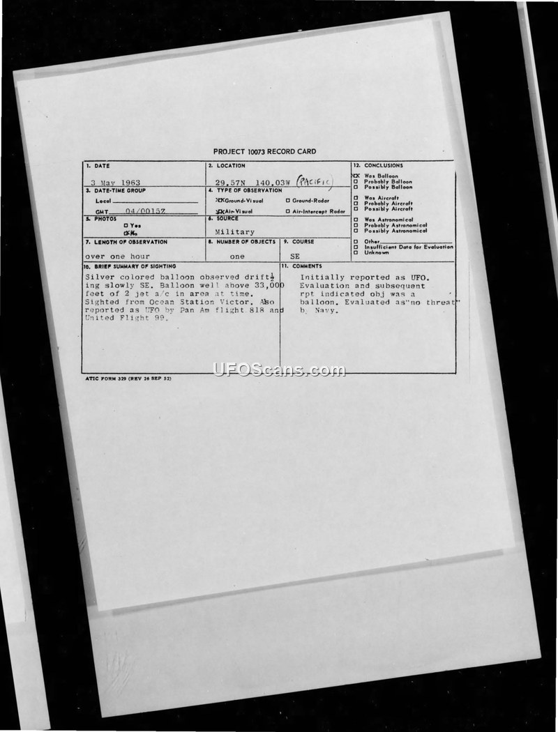 On May 3, 1963, a series of reports were filed regarding an unidentified aerial phenomenon observed in the vicinity of Ocean Station Victor in the Pacific Ocean (29-57N 140-03W). The object was first reported at 0015Z by OSV November, described as a large silver-colored balloon. The object remained in sight for over an hour, drifting slowly toward the east-southeast. Multiple aircraft, including Pan Am Flight 818, United Flight 99, United Flight 85, and various MATS flights, reported the object. Observations from passing jet aircraft at altitudes of 33,000 and 35,000 feet indicated the balloon was well above their flight paths. Subsequent descriptions characterized the object as being constructed of a thin, translucent, silver-colored material, generally spherical in shape, with a diameter estimated between 50 and 100 feet. Witnesses noted that the object appeared to change shape due to wind action. Despite the initial classification of the sighting as a UFO, military authorities conducted an evaluation and concluded that the object was a balloon. The final assessment by the military command was that the object posed no threat.