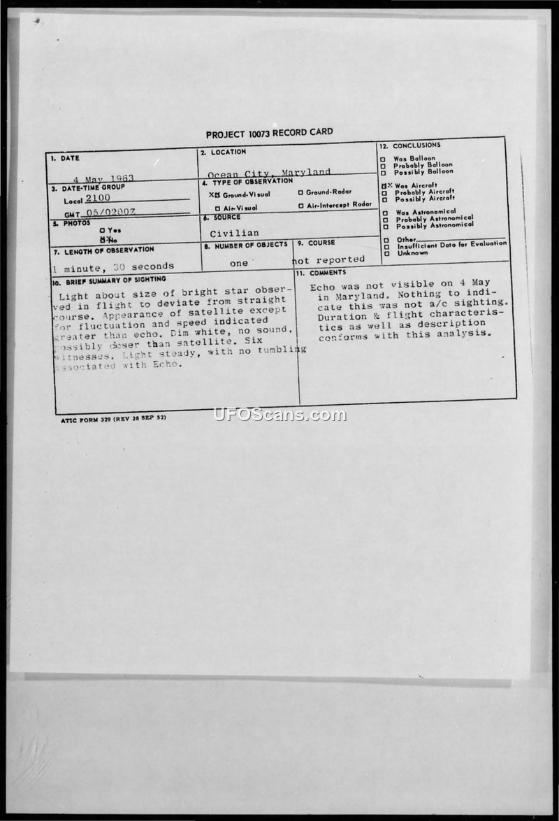 A civilian report of a light in the sky over Ocean City, Maryland, on May 4, 1963. The Air Force concluded the object was an aircraft, noting the Echo satellite was not visible at the time.