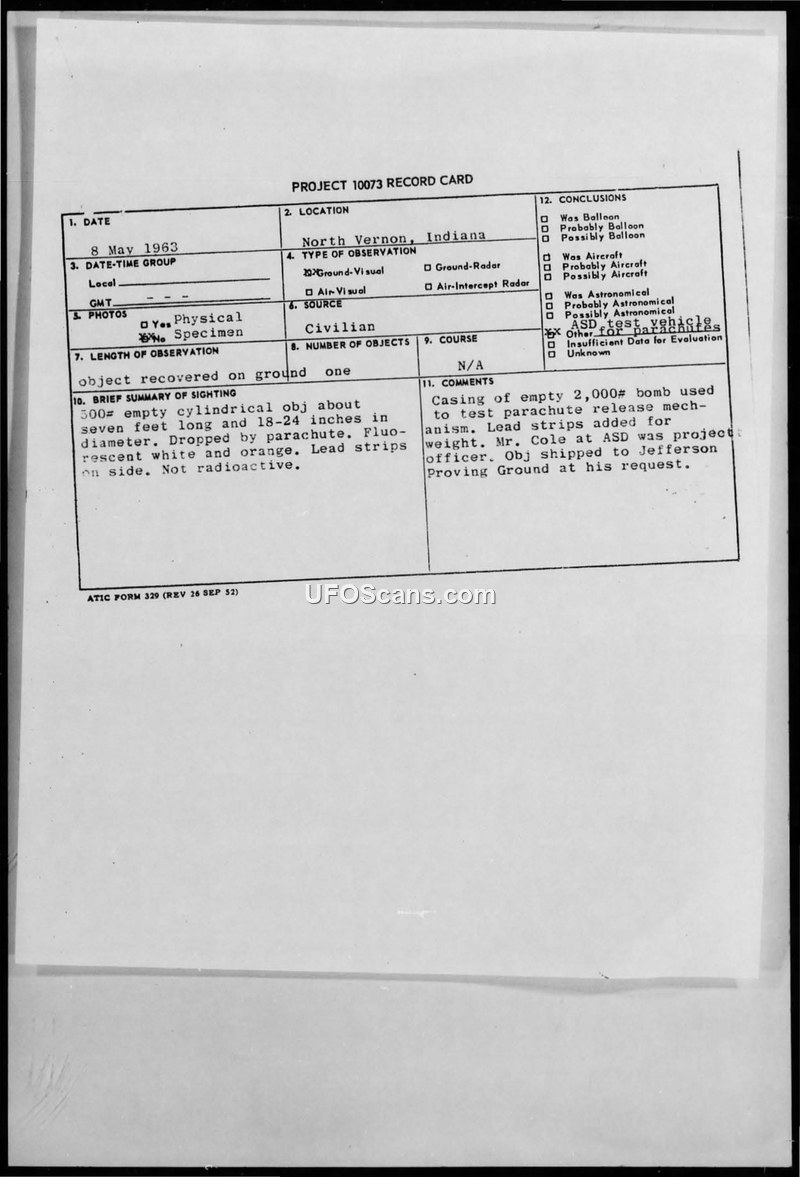 On May 8, 1963, a cylindrical object was recovered on the ground near North Vernon, Indiana, following a report of an unidentified fallen object. The object, described as being approximately seven feet long and 18 to 24 inches in diameter, was painted fluorescent white and orange and was found with a parachute. Local authorities, including the U.S. Air Force and State Police, were involved in the initial recovery. The object featured devices that appeared to be meters, though it lacked identifying lettering or numbering. It was determined not to be radioactive. Subsequent investigation by the Aeronautical Systems Division (ASD) identified the object as an empty 2,000-pound bomb casing utilized for testing parachute release mechanisms. Lead strips had been added to the casing to provide necessary weight for the test. The project officer for this test was identified as Mr. Cole at ASD. Following the recovery, the object was shipped to the Jefferson Proving Ground at the request of the project officer, with prior plans having been made to move it to Bunker Hill Air Force Base for further study.